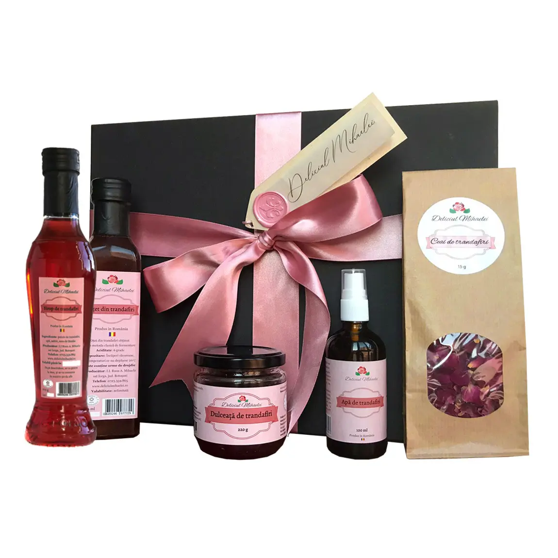 Produsele ajung la destinație gata de dăruit, împachetate în cutie de cadou, decorată la interior cu hârtie de mătase, franjuri și o ilustrată cu mesaj special „Dar din drag de trandafiri”, iar la exterior cutia e decorată cu panglică din satin și mici decorațiuni.